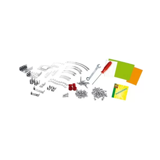 Contine: diferite piese metalice; suruburi si piulite; surubelnita; cheie; 3 culori de piese din spuma.